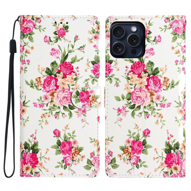 Bőrtok iPhone 16 Pro Max Piros Virágok Szíjjal