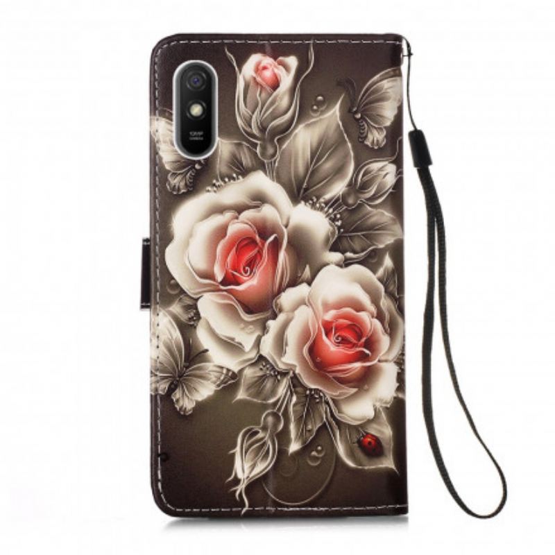 Fliptok / Bőrtok Xiaomi Redmi 9A szíjjal Fekete Rózsa Pánttal