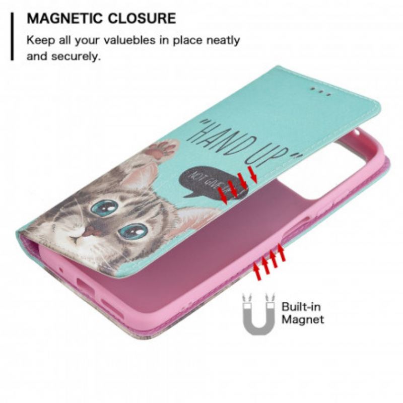 Xiaomi Redmi 10 Készüléke Teljesen Biztonságban Van Ezzel A Hand Up Macskával Díszített Flip Borítóval.
